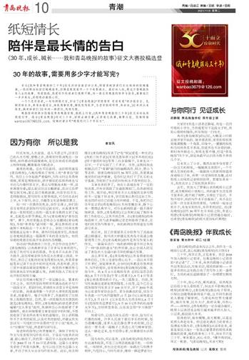 因为有你,所以是我。 《青岛晚报》带给我的人生启迪和收获,不是三言两语就能道尽的。一份报纸,一场情怀,余生注定我还将一如既往与你携手相伴,与党同心,与时代同步,继续一路追梦前行!