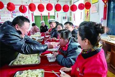 15日,市北交警威海路中队民警及社会爱心人士一行11人来到春雨残疾人辅助就业中心,和康复儿童、残疾青年一起过节。中午时分,民警将煮熟的饺子、汤圆送到孩子们手里。观海新闻/青岛晚报 记者 刘卓毅通讯员 张月军 陈媛媛