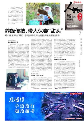 53岁的于周武是崂山区王哥庄街道王山口社区干部,也是一名养蜂带头人。他南下北上,拜师学艺,从最初4箱中蜂(又名中华蜂、土蜂)年产10斤蜜的“门外汉”,到现在上百箱中蜂年产2000斤蜜的专业“蜂匠”,成立崂顶蜜蜂养殖专业合作社,打造“崂山区标准化蜂场”,不仅实现了自己的创业梦,还将养蜂技艺毫无保留地传授给60余名徒弟,带领周边居民共同致富。