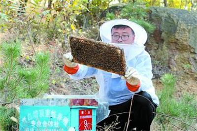 在王山口社区九桃山半山腰上,一个个蜂箱间隔3-5米静卧着,“嘤嘤嗡嗡”声此起彼伏。于周武穿梭于蜂箱间,细心查看蜂群活动情况。这些飞进飞出的蜜蜂,在于周武眼中都是宝贝,也是让他日子变甜的伙伴。 “蜜蜂养殖项目是在国家的三农大政方针指引下,迅速发展的标准化、规模化、集约化养殖产业,崂山独特的自然环境非常适合养蜂,投资少、效益好,开发绿色蜂系列产品,是环境友好型的富民产业,对维持生态平衡和生态农业的发展具有重要的意义。 ”谈及创业初心,于周武告诉记者,认识到养蜂的意义后,他进行了充分的考察和调研,形成可行性报告,得出的结论更让他干劲十足,于是便开始了这份 “甜蜜事业”,一干就是七年。