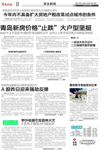 本报3月16日讯 16日,国家统计局官方网站公布了2022年2月份70个大中城市商品住宅销售价格变动情况。根据最新统计,2月“春节月”,青岛市新房、二手房成交量受到长假影响有所下降,但房价表现很“稳”。