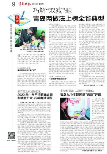 “双减”典型案例。记者注意到,全省共有10个教育教学“双减”典型案例上榜,其中青岛共有两个典型案例入选,分别为平度市探索课后服务新模式创办社区小学堂和青岛市西海岸新区海滨小学社会公益服务进校园。
