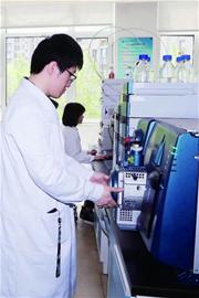 四楼的气质联用分析实验室内,检验员陈漪洁则在用进口的气相色谱仪进行卤代烃项目的检测。这一层的检验室里,还有用于重金属检测的电感耦合等离子体质谱仪、用于嗅味物质及氯苯类检测的气相色谱质谱联用仪等高科技检测“法宝”。