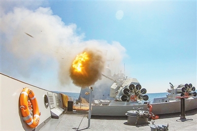 参赛舰临沂舰主炮射击。刘再耀 摄