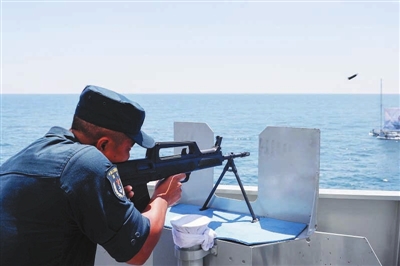 上午进行的是反恐反海盗科目比赛,该科目基于舰艇平时或战时执行多样化军事任务设置,旨在检验提升舰员海上实际使用轻武器能力。“参赛舰出击!”11时30分,随着裁判长一声令下,按照赛前抽签顺序,临沂舰、“响亮”号护卫舰依次进入射击阵位。双方参赛舰员先后使用轻武器,在100米外,分别对拖靶船上的10个海盗模拟靶进行射击。经过激烈比拼,“响亮”号护卫舰夺得第一名,临沂舰获得第二名。
