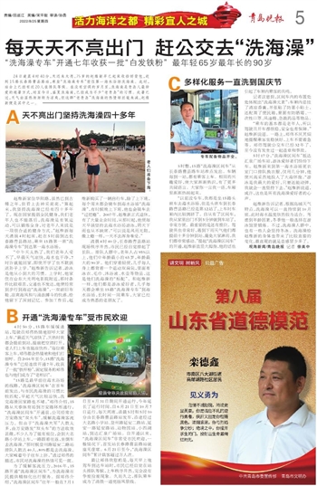 “以前没专车,我都是坐15路头班车去海水浴场,但是头班车到长春路曹县路已经是第12站了,上车时车厢内比较拥挤了。自从有了区间车,我从家里出门不到5分钟就到车站了,非常方便。最重要的是还有座位。驾驶员也非常好,遇到下雨天气他们都提前十多分钟到站,避免大家淋雨,我们都非常感动。”提起“洗海澡区间车”的开通,赵维新直竖大拇指,他的话也引起了车厢内乘客的共鸣。