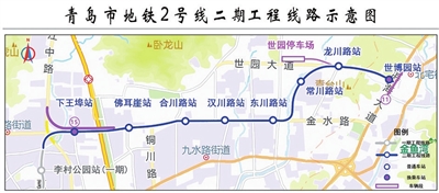 青岛地铁集团有限公司第一建设分公司工程管理处负责人介绍,地铁2号线二期工程是东岸城区的骨干线路,起于李村公园站(不含),止于世博园站,线路总长8.9千米,共8站10区间。其中下王埠站为15号线换乘站,世博园站为既有11号线换乘站。线路的建成将有效提升世博园及周边区域交通水平,对青岛市重点低效片区开发建设助力。