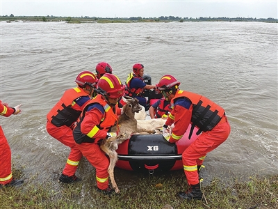救援人员迅速穿戴水域救援装备,驾驶橡皮艇赶赴老人被困位置,将老人扶至橡皮艇上并为老人穿好救生衣,顺利将老人救回。随后,救援人员又往返两次将11只羊救回岸边。牛看见主人回到岸边后也游了回来。