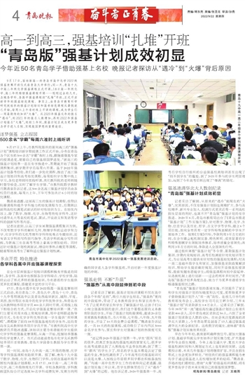 通过组织寒假“强基计划”冬令营、暑期强基计划集训、学期内常规培训、高考后校测前针对化培训等方式,为应届高考生提供有针对性的强基培优课程;对高一高二基础年级学生和家长,加强强基录取政策解读培训,帮助学生提前做好规划,同时开设强基衔接课程,提前发掘有潜能学生;将强基课程向初中段延伸,从选拔机制上进行创新……过去的两年多时间里,“青岛版”强基计划多角度出击,致力于为更多有潜质学生畅通强基报国之路。