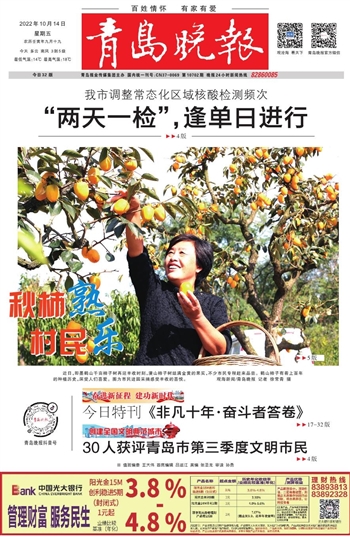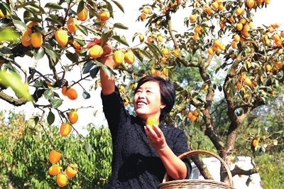 近日,即墨鹤山千亩柿子树再迎丰收时刻,漫山柿子树结满金黄的果实,不少市民专程赶来品尝。鹤山柿子有着上百年的种植历史,深受人们喜爱。图为市民进园采摘感受丰收的喜悦。 观海新闻/青岛晚报 记者 徐常青 摄