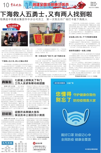10月7日晚,有游客在五四广场东侧发现,一名穿着浅色外套的女子正在向深海中走去。就在大家担心不已时,5名年轻人毅然冲进海中,将女子救回岸边。救人英雄当中,两名辅警的身份已经落实。经过网友们的接力,又有两名热心人现身:他们都是今年刚到青岛工作的工程建设者。