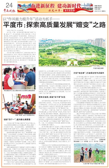 通过“作风能力提升年”活动,平度干部不断转作风、强能力、践初心,创新制定了提升城市活力和发展能级、加快乡村全面振兴、优化公共服务体系、打造半岛综合交通枢纽、营造和谐稳定发展环境等系列措施和机制,计划梯次培育一批20亿级、50亿级、100亿级的大企业和制造业集群,积极融入中国(山东)自贸试验区青岛片区、上合示范区以及“一带一路”倡议,让“投资青岛就是投资国家战略、选择平度就是选择青岛未来”成为广泛共识。