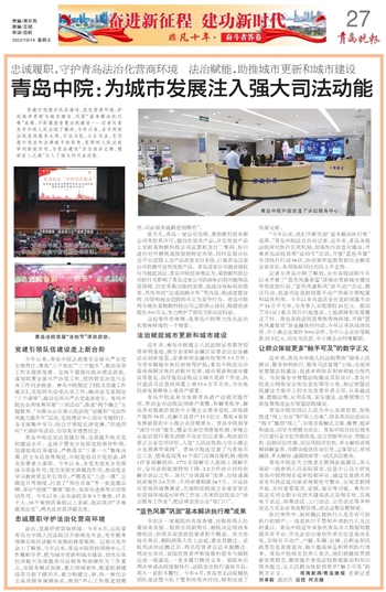 党建引领推动队伍建设、优化营商环境、护航城市更新与城市建设、巩固“基本解决执行难”成果、不断推进智慧法院建设……记者从青岛市中级人民法院了解到,今年以来,全市两级法院坚持服务大局,司法为民、公正司法,忠实履行宪法和法律赋予的职责,发挥好人民法院审判职能作用,为青岛建设“活力海洋之都、精彩宜人之城”注入了强大的司法动能。