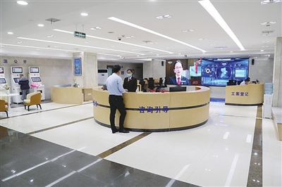 青岛中院坚持以人民为中心发展思想,加快推进“网上办公”和“网上办案”,将各类诉讼活动从“线下”搬到“线上”,实现非接触式立案、缴费、庭审和送达,切实方便群众诉讼。青岛中院对诉讼服务大厅进行全方位升级改造,设立智能导诉台、智能云柜、自助诉讼终端、诉讼风险评估机、多元解纷音视频调解室等,为群众提供咨询引导、立案登记、审判辅助、多元解纷、速裁快审等一站式诉讼服务。