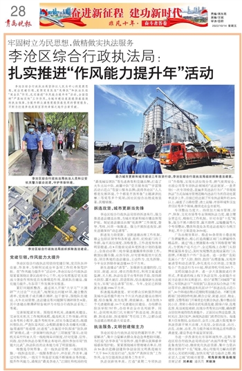 李沧区综合行政执法局坚持以人民为中心的发展思想,突出党建引领,发挥党员队伍“先锋队”和执法队伍“突击队”作用,扎实推进“作风能力提升年”活动,全面倡树“严真细实快”工作作风,为城市建设发展提供最高效的执法保障,为提升群众满意度提供最优质的管理服务,不断为打造李沧美丽宜居的幸福之地作出新贡献。