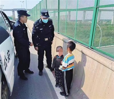 当天中午12时许,民警巡逻至机场高速与S397上里路高架桥路段时,发现前方有两名男童在路边追逐玩耍,身边不断有车辆快速驶过,民警立即靠边停车,下车后将两个孩子抱上车。