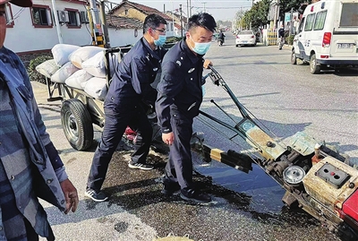 两名辅警立即帮助村民将车上的粮食卸到路边,随后协助村民将车头推到附近的修理厂。村民对辅警的帮助表示了感谢。