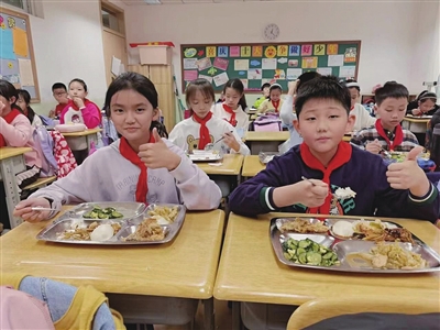 青岛文登路小学食堂“出品”的美味午餐让学校的孩子们竖起大拇指。
