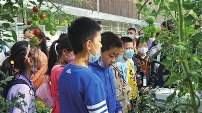 无土栽培车间里,西红柿植株生长在悬挂式栽培架上,沿着牵引绳向上攀援,展示着生命的蓬勃与恣肆。“这里的西红柿采用基质栽培的方式,生长在椰壳条中,所有的水肥通过灌溉系统精准施用。”产业园农业专家为小记者们详解了植物工厂无土栽培的“奥秘”。她介绍,植物工厂在实现智能化的同时,还特别注重生态效益。冬季工厂作物“取暖”采用水暖方式,最大程度节约资源,引入熊蜂为西红柿授粉,将农人从繁重的人工授粉中解放出来,在植物工厂内保留了天人合一、动植物和谐共生的自然朴素美学。