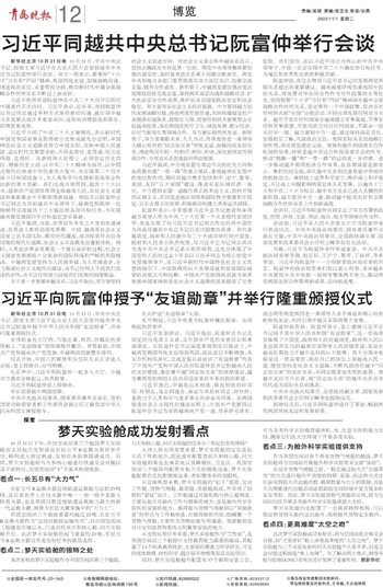 习近平发表讲话。习近平指出,阮富仲总书记是坚定的马克思主义者,是中国共产党的亲密同志和真诚朋友。在阮富仲总书记高度重视和亲自推动下,中越两党两国传统友谊得到巩固,政治互信不断增强,务实合作持续深化,交流互鉴日益密切。“友谊勋章”代表了中国共产党和中国人民对阮富仲总书记和越南人民的友好感情,象征着中越“同志加兄弟”的深厚情谊,蕴含着两党和两国人民共同追求美好未来的殷切希望。