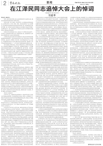 江泽民同志同我们永别了。他的英名、业绩、思想、风范将永载史册,世世代代铭刻在人民心中。全党全军全国各族人民要更加紧密地团结在党中央周围,踔厉奋发、勇毅前行,为全面建设社会主义现代化国家、全面推进中华民族伟大复兴而团结奋斗。