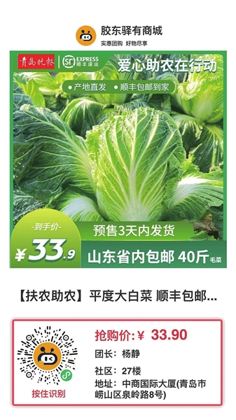 12月6日,本报《给力!两天买走28000多斤白菜 助农!滞销菜继续等你来认购》稿件刊发后,又收到了众多热心市民的来电,得知种植户们遇到的困境,大家纷纷伸出援手,希望能助农户们一臂之力。此前,我们主要接受企业报名与种植户对接,购买“爱心菜”。为让更多热心市民也能直接购买到“爱心菜”,《青岛晚报》携手顺丰速运共同发起爱心助农在行动,所有“爱心菜”均由产地直发,并且通过顺丰包邮到家。本次推出的“爱心菜”一份售价33.9元,重量为40斤左右,欢迎广大想要购买“爱心菜”的市民踊跃下单。 观海新闻/青岛晚报 记者 李沛