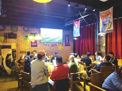在宁夏路的精酿酒吧内,观众边喝啤酒边观看球赛。薛飞 摄