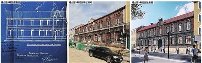从左至右为博山路3号历史图纸、沿街现状照片、效果图。