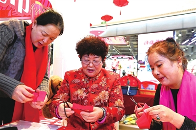 西海岸新区一商场,非遗剪纸传人程丕昉(中)在指导剪纸爱好者。俞方平 摄