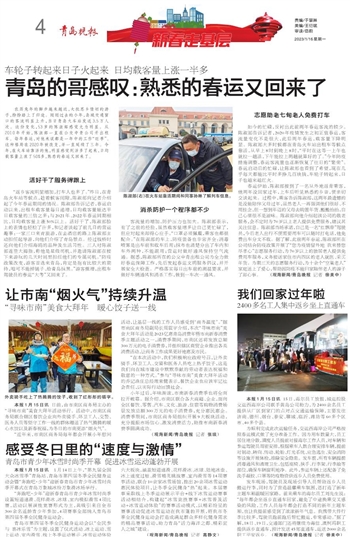 “返乡客流明显增加,打车人也多了。”昨日,在青岛火车站等候点,趁着候客间隙,陈淑部向记者介绍起了今年春运期间的情况。陈淑部告诉记者,春运启动以来,出租车载客量每日递增,日均载客量能达平日载客量的三倍之多;与2021年、2022年春运同期相比,日均载客量上涨50%以上。活好干了,陈淑部脸上的表情也轻松了许多,和记者谈起了前几日的营运趣事:一家三口来青旅游,在去酒店的路上陈淑部主动担任起导游,向他们介绍了青岛景点。经过栈桥时还向他们介绍海鸥的品种及生活习性。三人对陈淑部连竖大拇指,称他是星级司机,并邀请陈淑部在接下来游玩的几天时间里担任他们的专属司机。“防疫政策改变,游客首选来青岛,肯定是抱有比较大的期待,咱可不能掉链子、给青岛抹黑。”游客骤增,出租车驾驶员的春运“大考”又回来了。