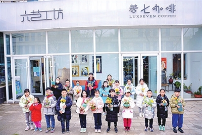 “我选的可不是平时家里常见的高高的花瓶,而是一个矮矮胖胖的大口花器,这样的花器可怎么插花啊?见我犯难的表情,老师拿来了一大块花泥,把原本宽阔的花器口紧紧塞满,并告诉我可以自己挑选花材了。”李秉衡完成了插花作品,“我看着花器里插的一片紫色花,立刻想到了前两天在书里看到的‘紫气东来’这个词,不如就用它当我的插花名字吧,希望在新的一年里,我家能紫气东来,好运常在!”