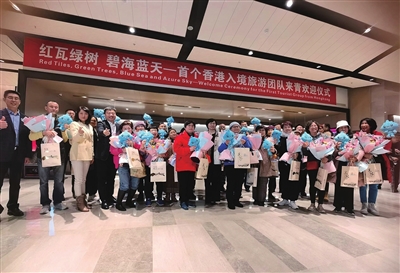 2月12日15:00,在沉寂三年之后,山东首个入境旅游团队的23名香港游客抵达青岛胶东国际机场;17:00,首个香港入境旅游团队来青欢迎仪式在国信金融中心酒店大堂举办。