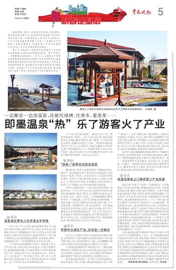 第三产业的进步,是经济社会发展到一定阶段的必然趋势,也是社会日渐发达的标志。第三产业中,一个重要部分是旅游业。2月11日,记者探访了即墨区温泉街道的温泉酒店后发现,从春节假期开始,温泉游的热度持续走高:有的酒店周末的客房入住率是去年同期的两倍多,有的酒店今年40天的客流同比增长了40%。温泉游,早已不仅是住旅店泡温泉,越来越多的“温泉+”项目,悄然来到了市民和游客的身边。