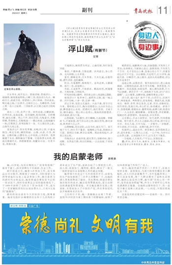 《浮山赋》是青岛作家过客继《浮山之恋》《浮山四百阕》之后,为浮山专题系列写作的又一部典型作品。这篇新作是过客在数百次行吟浮山基础上,融合长期心得创作完成的,结尾更赋予浮山九点的“九”以五四精神等“九”的文化内涵。