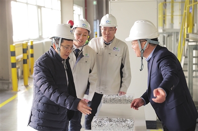 全国人大代表周云杰(左一)在海尔再循环互联工厂调研。