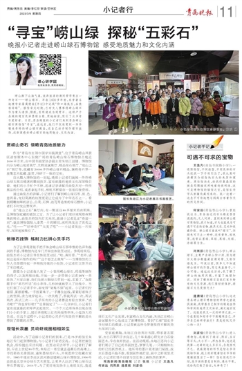 自从踏入博物馆的一刻起,晚报小记者们就被一件件崂山绿石展品精湛的雕刻技艺、富有底蕴的地质文化深深吸引着。他们的小手忙个不停,迅速记录讲解员曲俊杰对一件件展品的介绍,或者拿起手机、相机不断留存一张张印象资料。