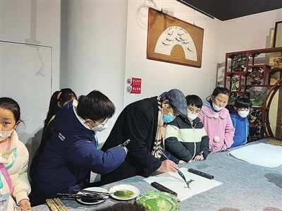 馆长朱培江为小记者展示书画技艺。
