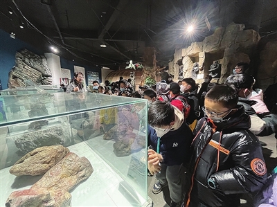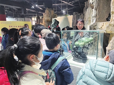 在“他山之石”展厅内,有一颗直径80多厘米的夜明珠,是博物馆收藏的镇馆之宝。为了让小记者们更好地观察夜明珠的特点,曲俊杰将馆内灯光关闭,邀请小记者见证“奇迹一刻”:就在博物馆陷入漆黑一片的瞬间,夜明珠发出了荧荧之光。“哇——”“好神奇!”“太美了吧”……小记者发出一片惊呼,深深地被吸引了。