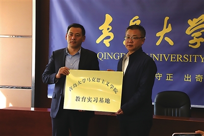 本报5月22日讯 近日,青岛实验高中附属初中与青岛大学马克思主义学院签约“教育实习基地”揭牌仪式在青岛大学举行。仪式上,青岛大学党委副书记肖江南与青岛实验高中附属初中校长逄增金共同为实践基地揭牌,两校就联合开展“大中小思政课教师队伍一体化建设”签订协议。