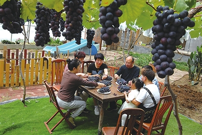 即墨区移风店镇的葡萄因个大、味甜形成了品牌特色。葡萄种植户从原来单纯的种葡萄、卖葡萄向采摘体验、旅游休闲、餐饮娱乐综合性转变,“移风葡萄”这一特色旅游农产品的开发,激活了移风店镇吃、住、行、游、玩、购的乡村文旅市场。(观海新闻/青岛晚报 记者 刘卓毅 通讯员 张涛)