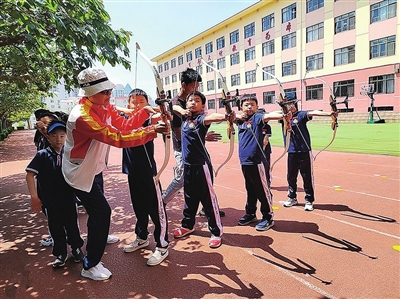 青岛新世纪学校不仅重视社团建设,也会在体育课上逐步普及射箭课程,让更多学生体验射箭的乐趣。