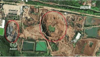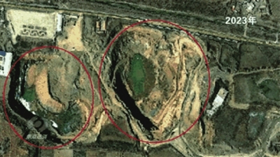 记者查阅了从2018年至今的卫星图片:2018年,北面大坑上面原来有厂房,还有道路,南面是一个尾矿库。2019年,地块南北同时出现新挖的坑,之后这两个坑不断扩大。到了2020年,北面的厂房已经不见了,南面的坑也在变大。2021年、2022年,两个大坑都在变大变深,逐渐靠拢,到了2023年,最终形成了现在的样子。