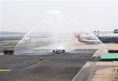 北京首都国际机场以水门礼迎接MU9191。新华社发