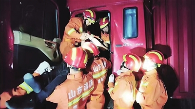 随后,救援人员又对半挂车前挡风玻璃破拆,将困在副驾驶一侧的两人救出,并移交给120医护人员。经过及时救治,四人并没有生命危险。