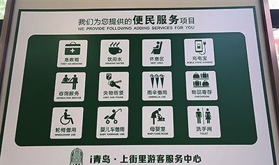 “您好,请问有什么可以帮您的?”这样的话,张静每天可能要重复上百遍。“您好,可以用一下卫生间吗?”在了解到游客黄女士的需求后,张静满脸笑容地将她和朋友指引到卫生间处。从卫生间出来后,黄女士又咨询了三江里的具体位置。张静详细清晰地指明位置后,还贴心地提醒她们可以接水喝,将行李寄存在中心内,轻装前往景点。“中山路非常有‘青岛味道’,街头装置又很时尚,我们在这里玩得很开心。有这样的服务中心对游客来说太方便了。”黄女士从深圳远道而来,谈起中山路之行不吝赞美。