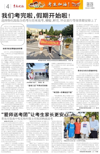 9日16时30分,青岛五十八中教师送考“天团”已经整装待发,当天他们没有再穿首日送考的红色“战袍”,而是选择了黄色T恤,寓意“走向辉煌”。