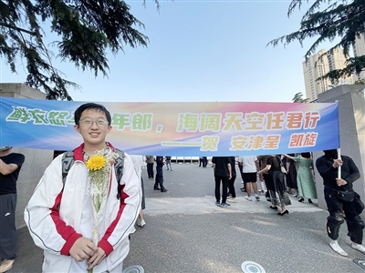 在五十八中考点门口,一条横幅格外醒目:“鲜衣怒马少年郎 海阔天空任君行 贺安津呈凯旋”,这是五十八中考生安津呈的父母为他定制的庆祝横幅,引得同学们纷纷围观,大呼:“安津呈你火了。”而“当事人”走出考场看到横幅时,也是惊讶得合不拢嘴。“我爸说要给个惊喜,我还以为是送花什么的呢,结果真是好大一个惊喜!”安津呈说,父母总是喜欢在家“搞事情”营造欢乐氛围,自己也是乐在其中,“苦读12年,这个横幅就是最好的见证。”在安先生眼里,送横幅是一种仪式感,“我们家仪式感比较足,节假日都会营造过节氛围,比如国庆带孩子看升国旗,樱花季六点多拉着孩子去赏樱。孩子念书这么多年不容易,我们想用一个小小的仪式来纪念这一难忘的时刻。”安先生告诉记者。