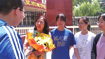 6月9日,政治科目考试结束,学生给班主任孙云霞送花束。