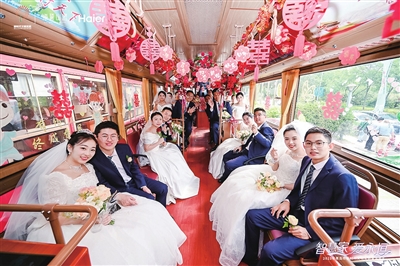 新人乘铛铛车出发从海尔洲际酒店行至活动主会场。