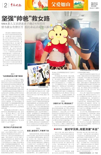 SMA被称为脊髓性肌萎缩症,是一种罕见的遗传性神经肌肉疾病。在SMA患儿家长交流群里,有一位来自青岛的6岁小姑娘禾苗(化名)成为了众多家庭决心把罕见病治下去的动力和目标。她在不幸确诊SMA后,先后接受了正规的康复治疗和药物治疗,又幸运地赶上了高价“救命药”进入医保目录。在一次次“我命由我不由天”的顽强抵抗中,她实现了一个又一个堪称奇迹的里程碑:软塌的腹部有了力量的迹象、无力的下肢能够支撑身体独自站立、在康复师的帮助下正在学习走路……在父亲节即将到来之际,记者在青岛脑病康复医院流亭院区采访了禾苗爸爸苏鹏(化名),听他自述抗争与坚信并存的救女之路。